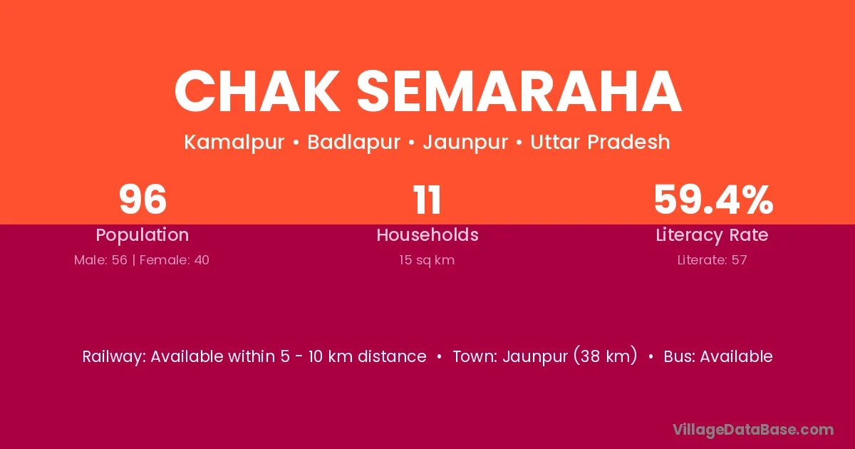 Jaunpur (38 km) is the nearest town to Chak Semaraha village for major economic activities and is located approximately 38 km away.