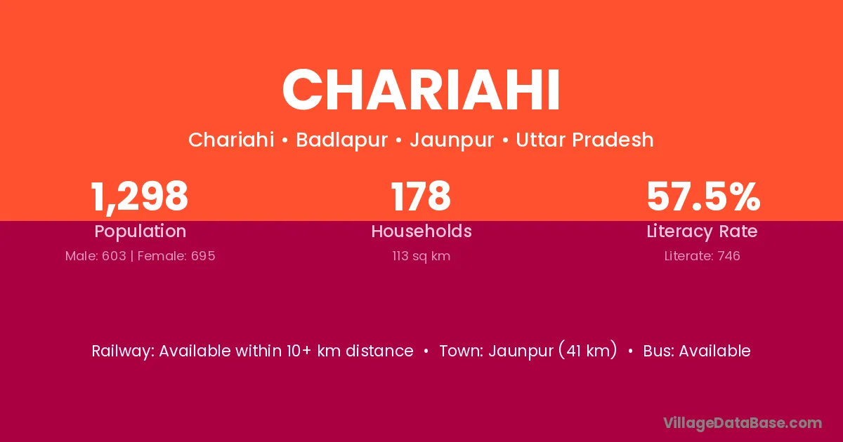 Jaunpur (41 km) is the nearest town to Chariahi village for major economic activities and is located approximately 41 km away.