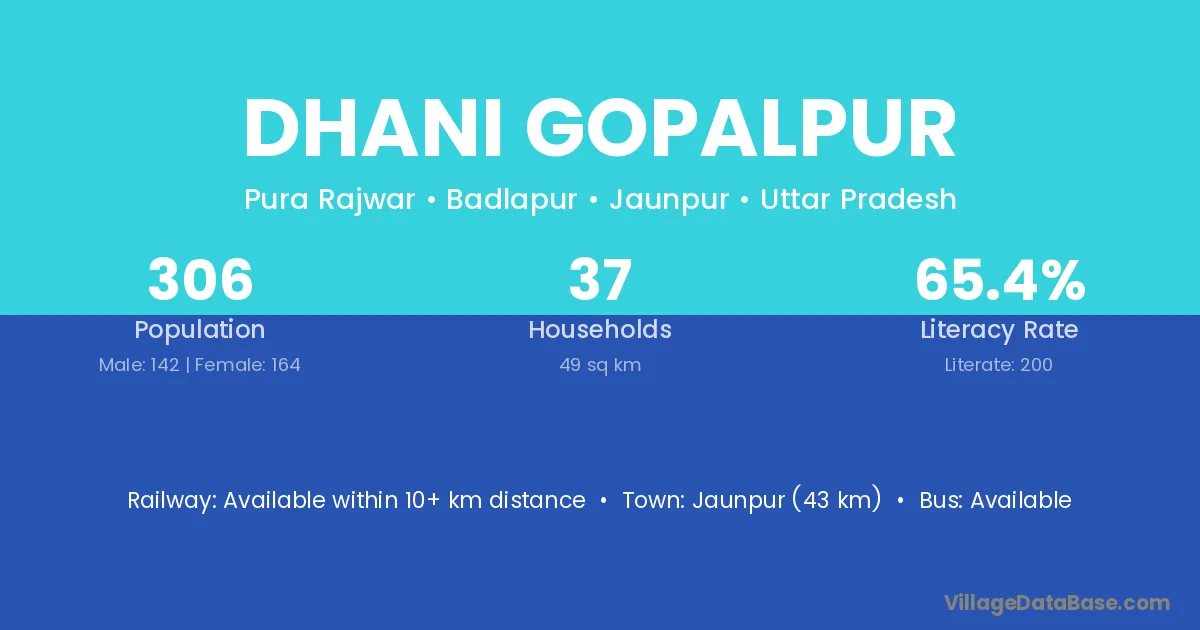Jaunpur (43 km) is the nearest town to Dhani Gopalpur village for major economic activities and is located approximately 43 km away.