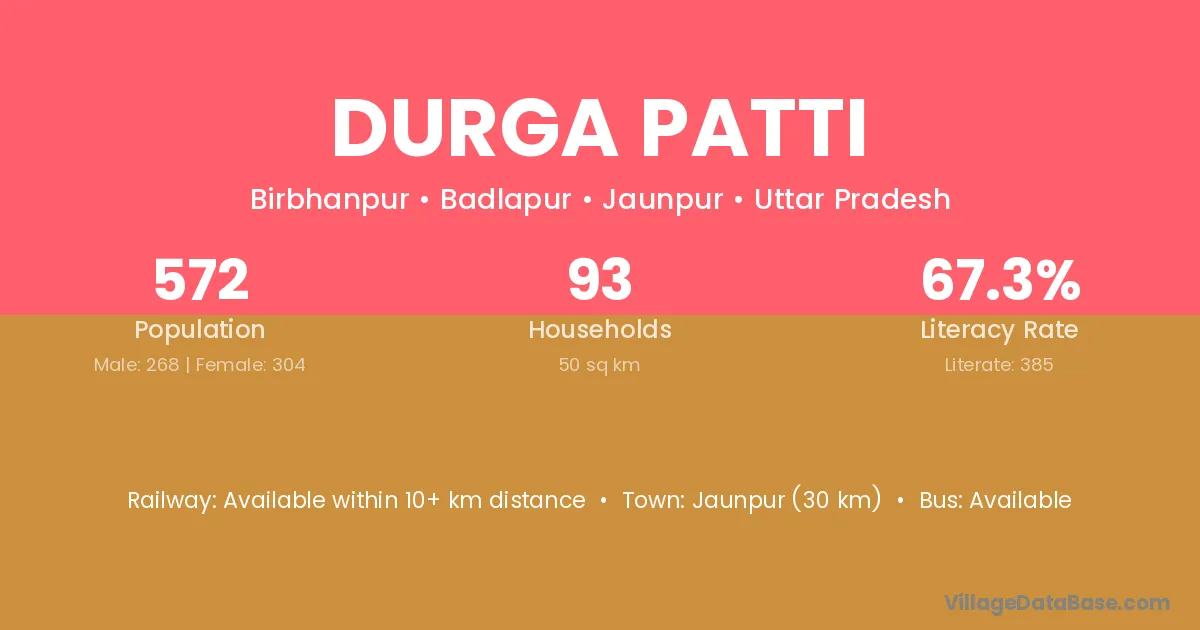 Jaunpur (30 km) is the nearest town to Durga Patti village for major economic activities and is located approximately 30 km away.