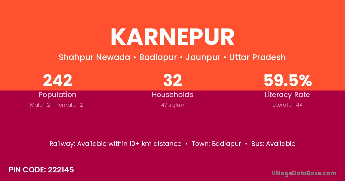 Karnepur village has a total population of 242 people, of which 121 are males and 121 are females.