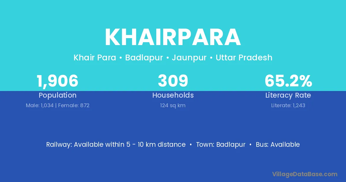 Khairpara village has a total population of 1,906 people, of which 1,034 are males and 872 are females.