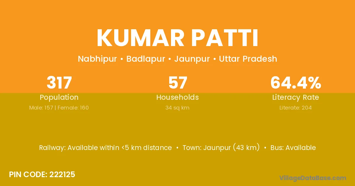 Jaunpur (43 km) is the nearest town to Kumar Patti village for major economic activities and is located approximately 43 km away.