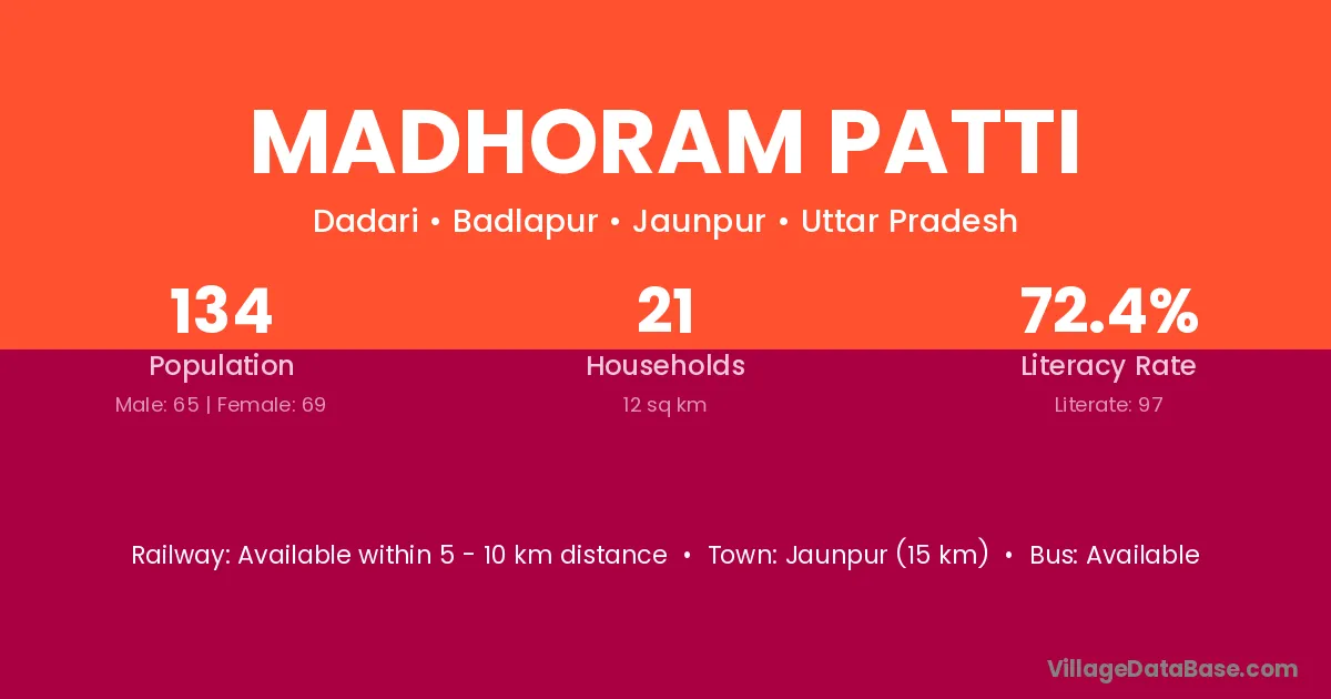 Jaunpur (15 km) is the nearest town to Madhoram Patti village for major economic activities and is located approximately 15 km away.