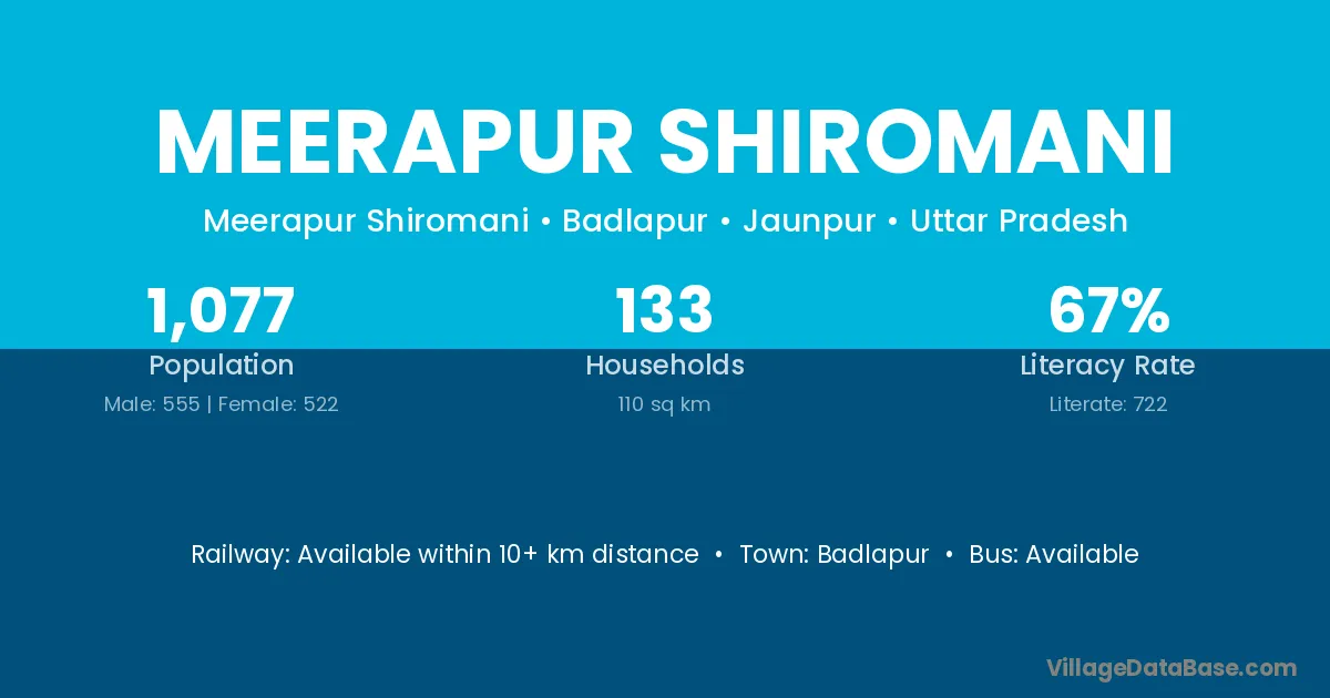 Meerapur Shiromani village has a total population of 1,077 people, of which 555 are males and 522 are females.