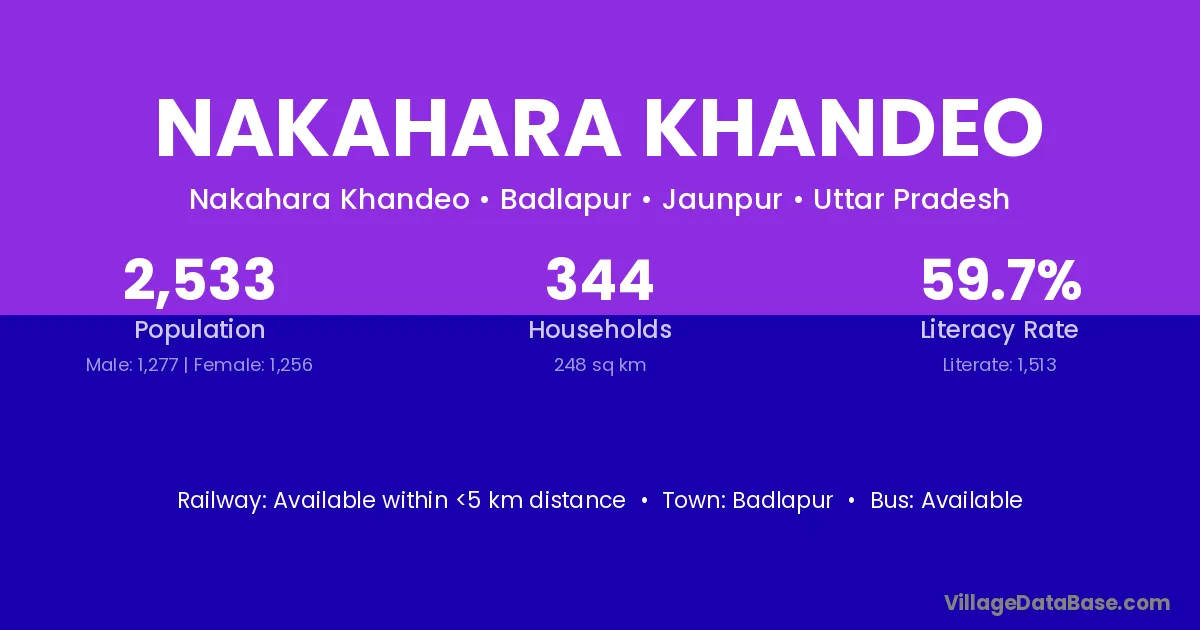 Nakahara Khandeo village has a total population of 2,533 people, of which 1,277 are males and 1,256 are females.