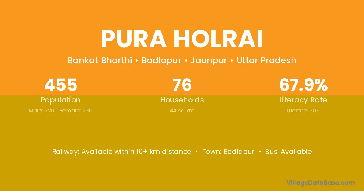 Pura Holrai village has a total population of 455 people, of which 220 are males and 235 are females.