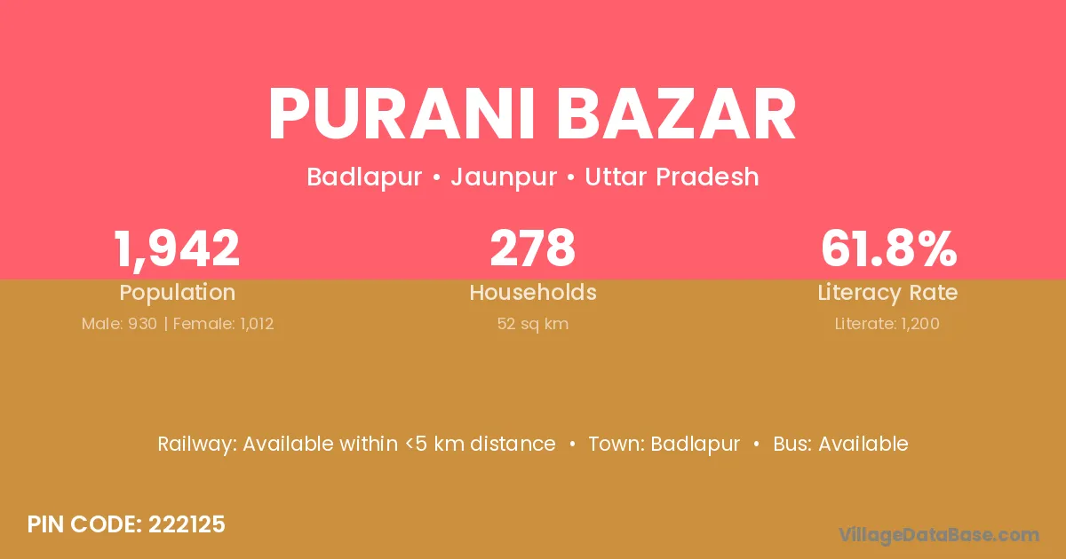 Purani Bazar village has a total population of 1,942 people, of which 930 are males and 1,012 are females.
