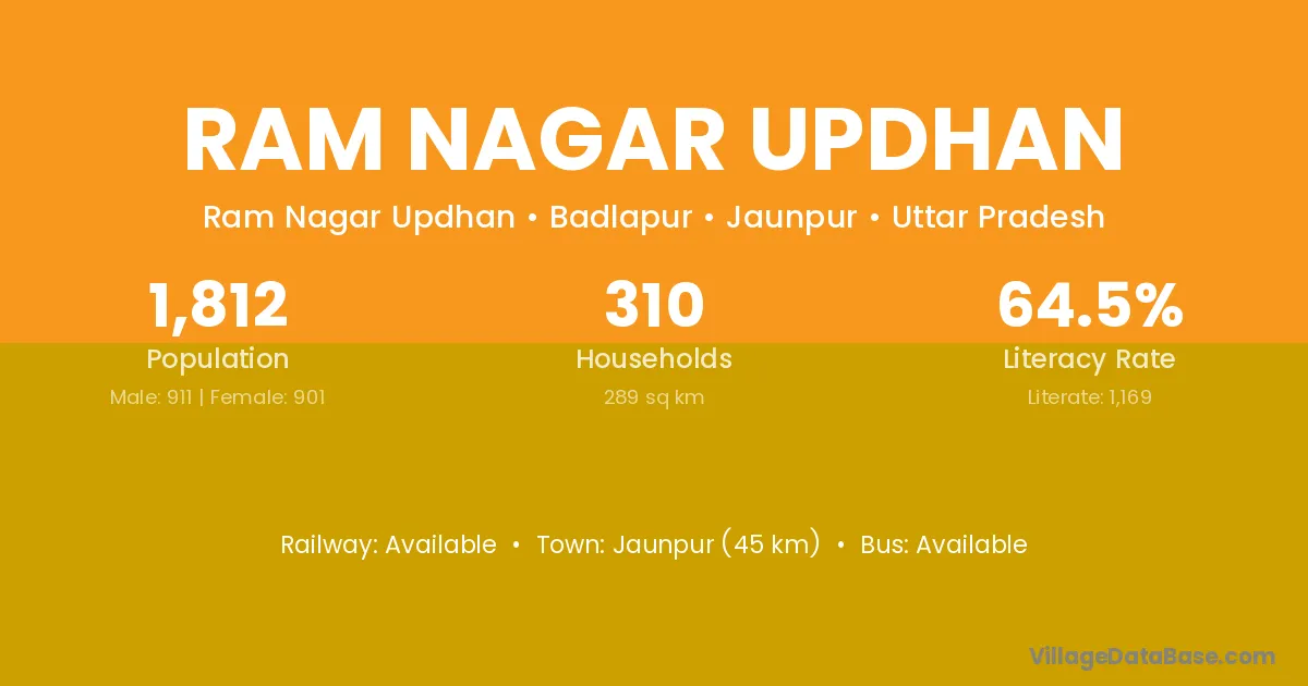 Jaunpur (45 km) is the nearest town to Ram Nagar Updhan village for major economic activities and is located approximately 45 km away.