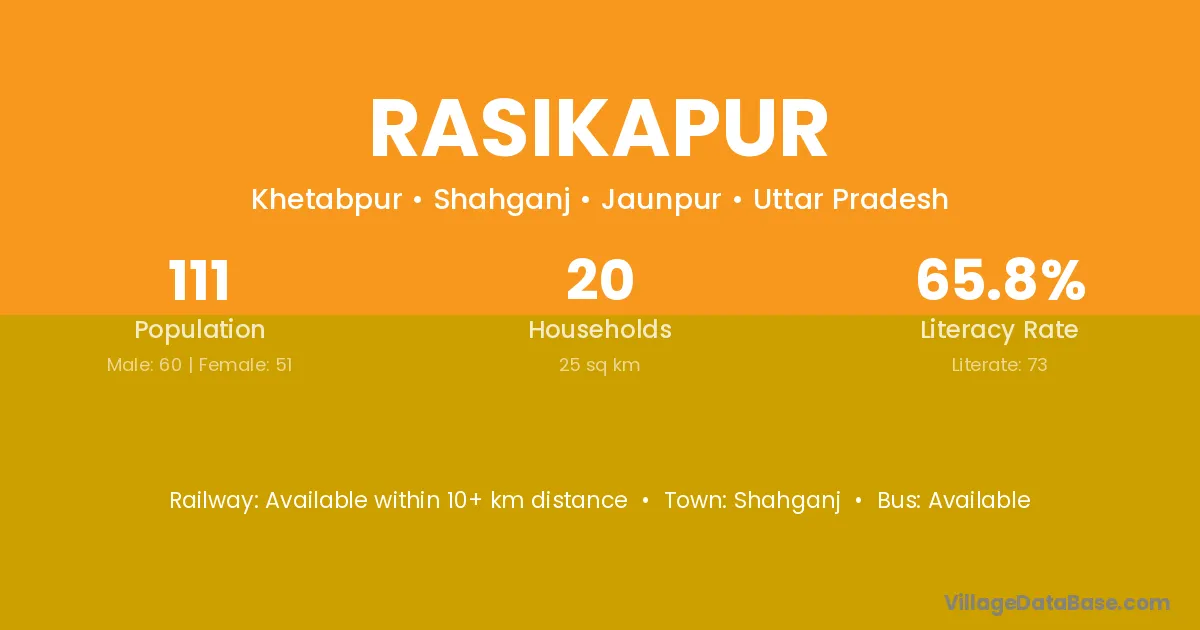 The literacy rate of Rasikapur village is 61.89%. Male literacy stands at 72.94% and female literacy at 51.22%.