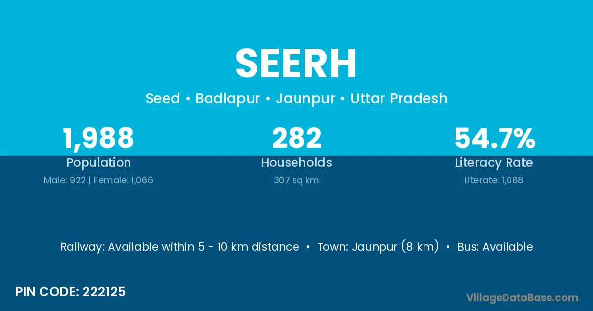 Jaunpur (8 km) is the nearest town to Seerh village for major economic activities and is located approximately 8 km away.