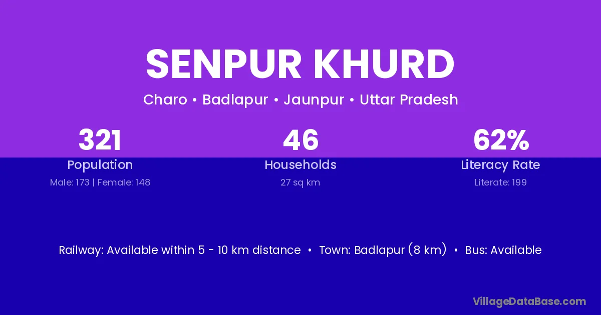 Senpur Khurd village has a total population of 321 people, of which 173 are males and 148 are females.