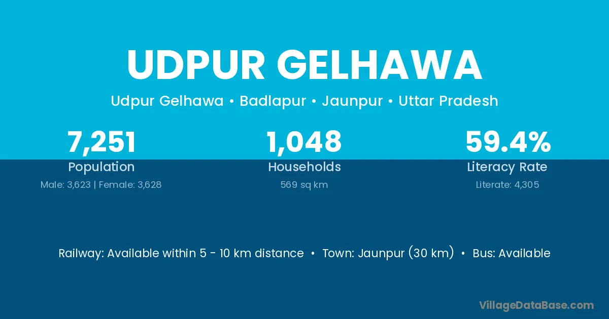 Jaunpur (30 km) is the nearest town to Udpur Gelhawa village for major economic activities and is located approximately 30 km away.