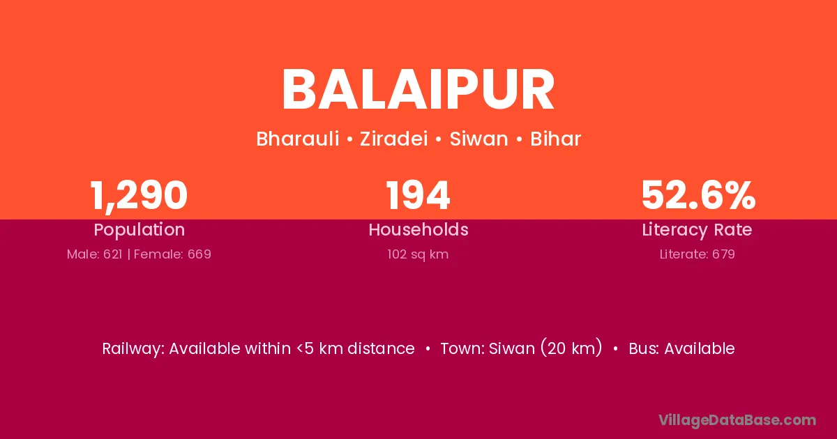 The literacy rate of Balaipur village is 57.69%. Male literacy stands at 66.54% and female literacy at 49.89%.