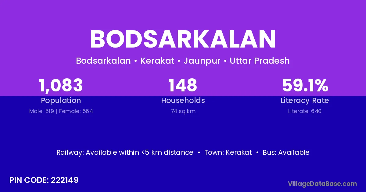 Bodsarkalan village has a total population of 1,083 people, of which 519 are males and 564 are females.