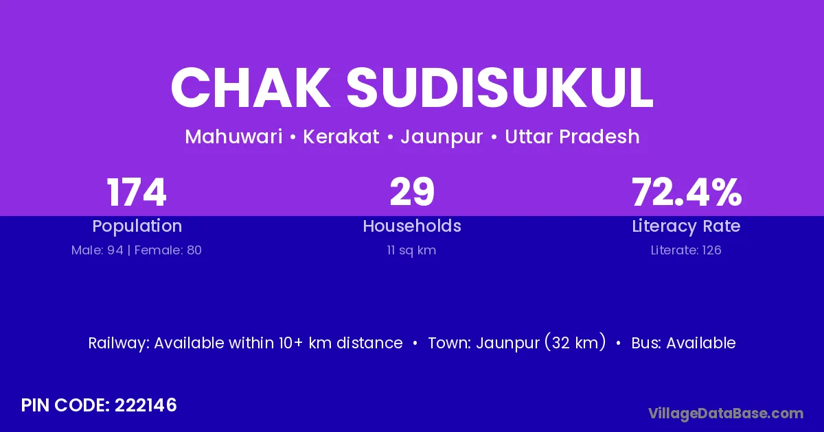Jaunpur (32 km) is the nearest town to Chak Sudisukul village for major economic activities and is located approximately 32 km away.