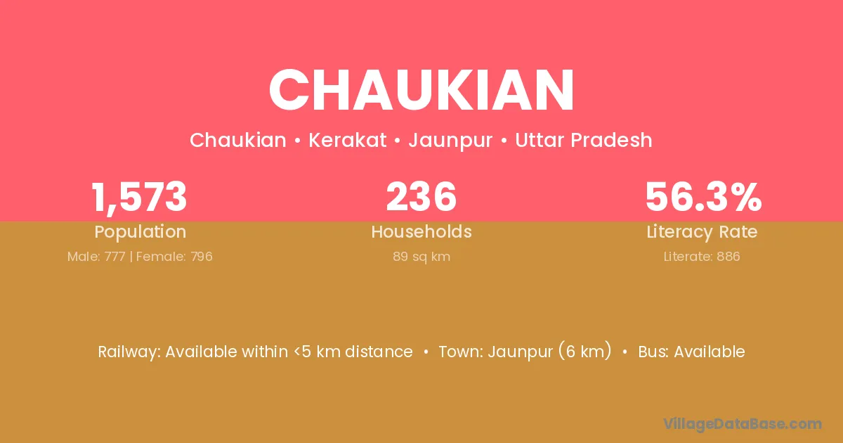Jaunpur (6 km) is the nearest town to Chaukian village for major economic activities and is located approximately 6 km away.