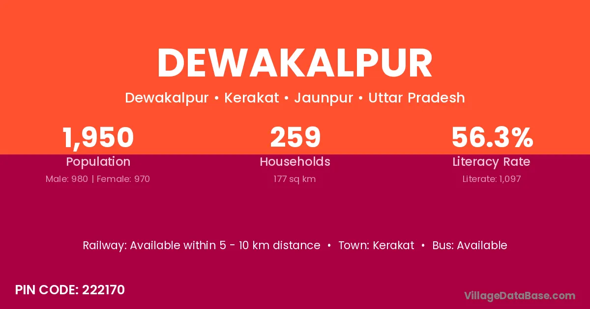 Dewakalpur village has a total population of 1,950 people, of which 980 are males and 970 are females.
