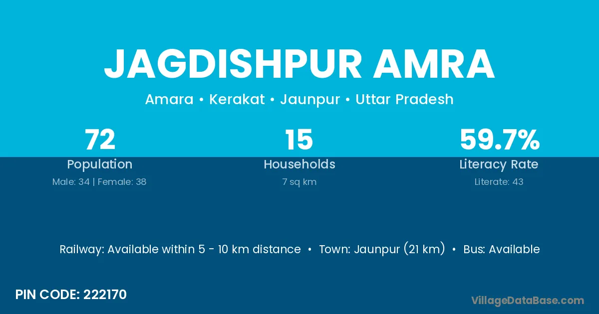 Jaunpur (21 km) is the nearest town to Jagdishpur Amra village for major economic activities and is located approximately 21 km away.
