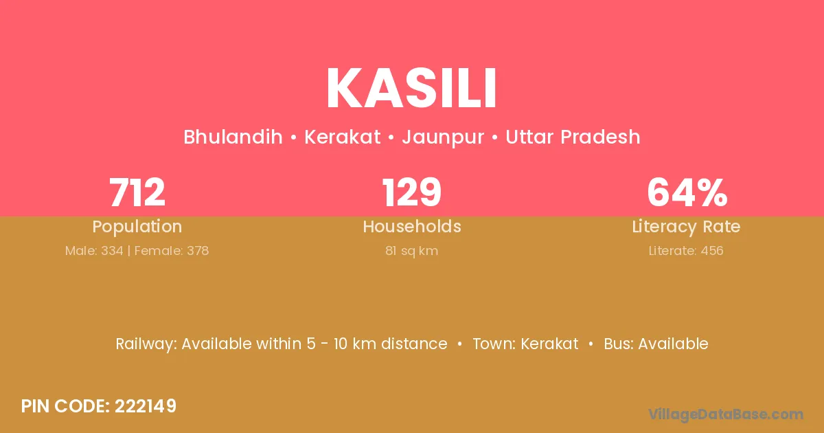 The literacy rate of Kasili village is 64.04%. Male literacy stands at 73.95% and female literacy at 55.29%.