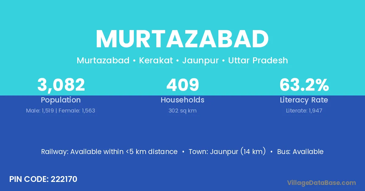 Jaunpur (14 km) is the nearest town to Murtazabad village for major economic activities and is located approximately 14 km away.