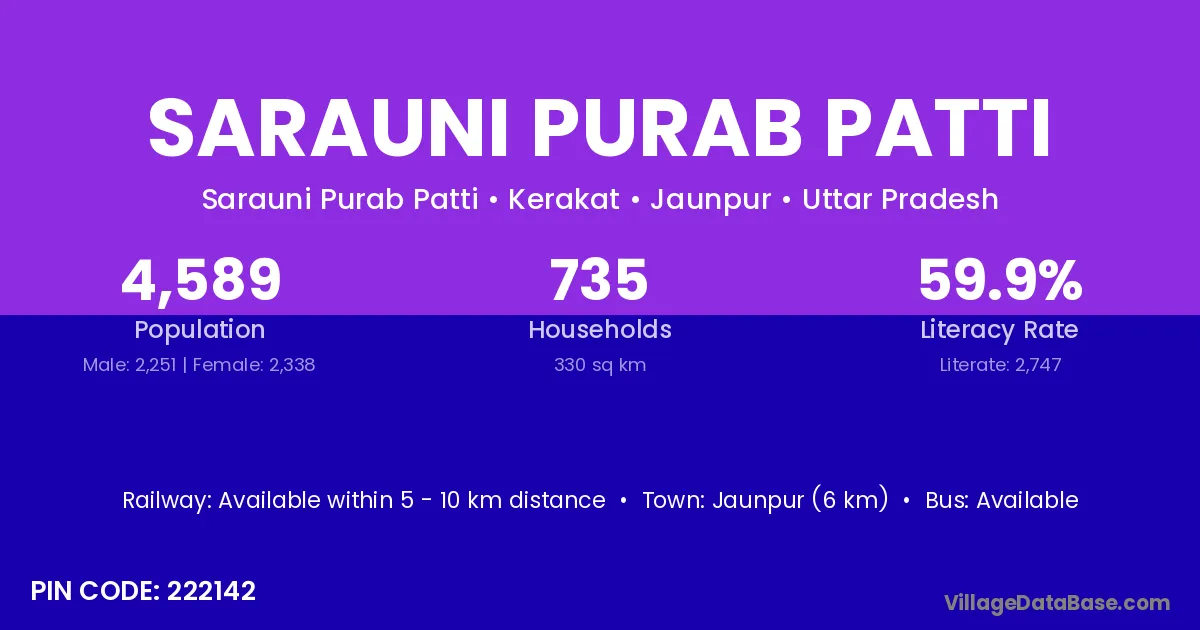 Jaunpur (6 km) is the nearest town to Sarauni Purab Patti village for major economic activities and is located approximately 6 km away.