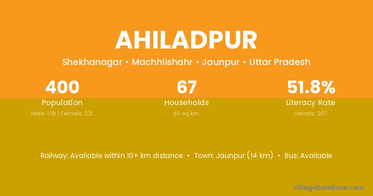Jaunpur (14 km) is the nearest town to Ahiladpur village for major economic activities and is located approximately 14 km away.