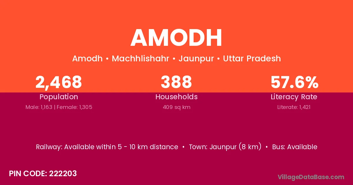 Jaunpur (8 km) is the nearest town to Amodh village for major economic activities and is located approximately 8 km away.