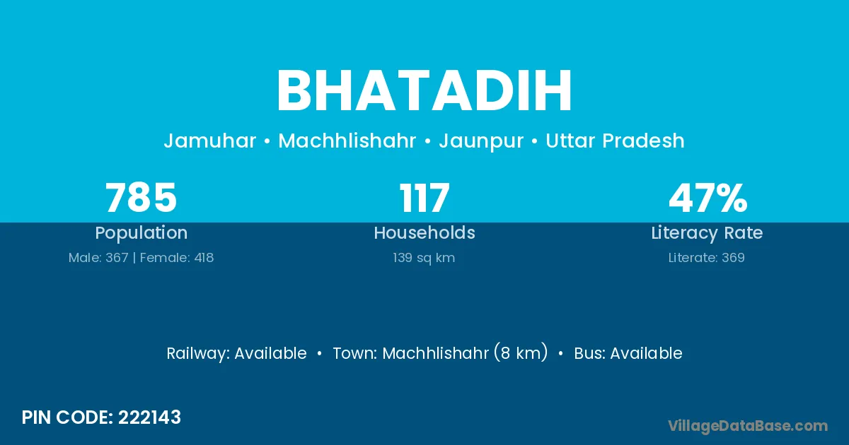 Machhlishahr (8 km) is the nearest town to Bhatadih village for major economic activities and is located approximately 8 km away.