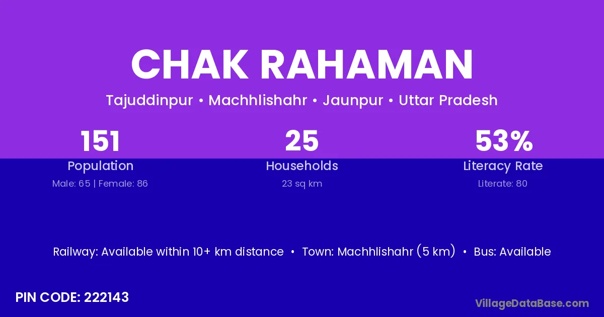 Machhlishahr (5 km) is the nearest town to Chak Rahaman village for major economic activities and is located approximately 5 km away.