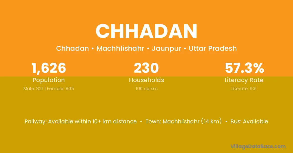 Machhlishahr (14 km) is the nearest town to Chhadan village for major economic activities and is located approximately 14 km away.
