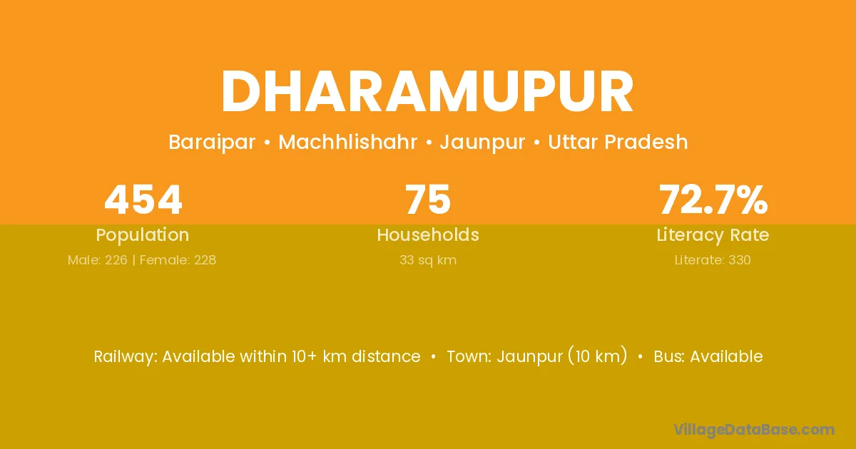 Jaunpur (10 km) is the nearest town to Dharamupur village for major economic activities and is located approximately 10 km away.
