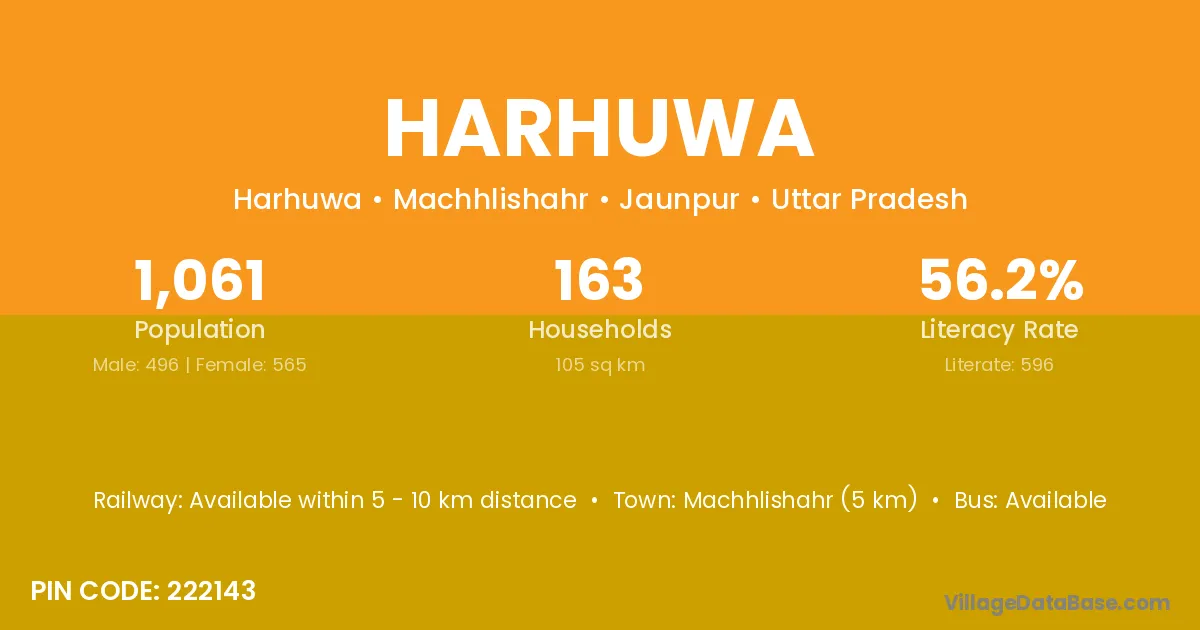 Machhlishahr (5 km) is the nearest town to Harhuwa village for major economic activities and is located approximately 5 km away.