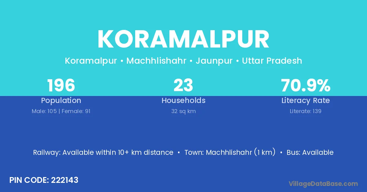 Machhlishahr (1 km) is the nearest town to Koramalpur village for major economic activities and is located approximately 1 km away.