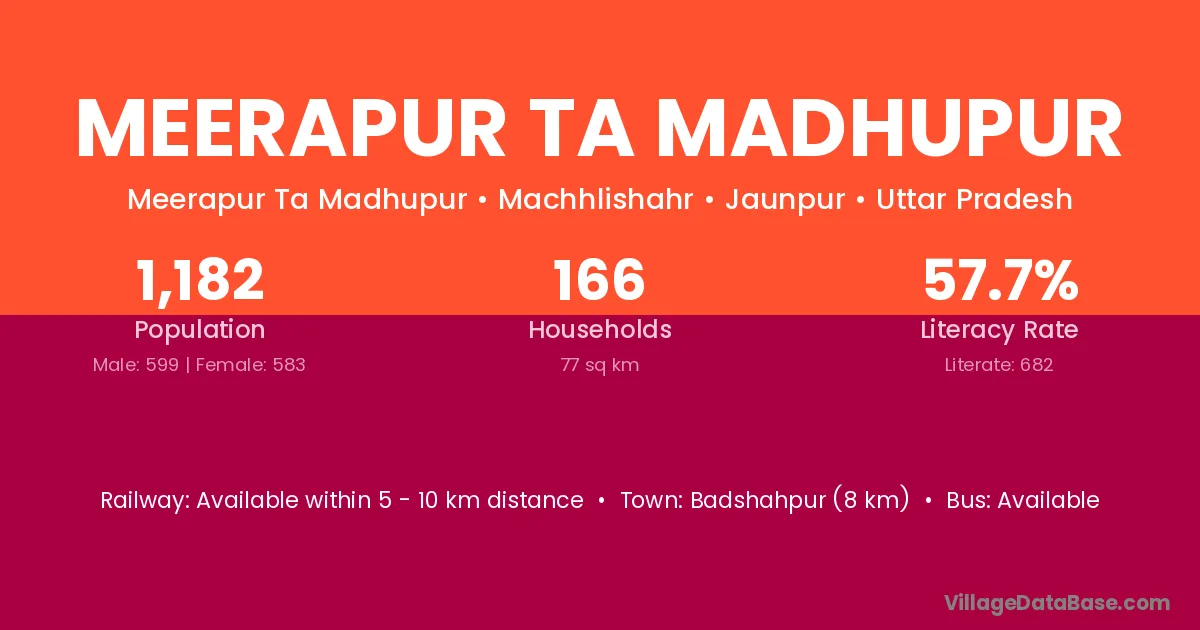 Badshahpur (8 km) is the nearest town to Meerapur Ta Madhupur village for major economic activities and is located approximately 8 km away.