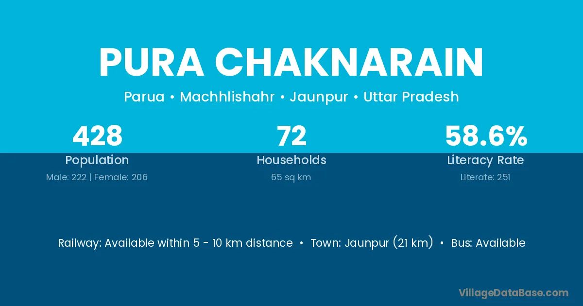 Jaunpur (21 km) is the nearest town to Pura Chaknarain village for major economic activities and is located approximately 21 km away.