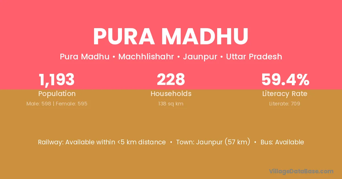 Pura Madhu village has a total population of 1,193 people, of which 598 are males and 595 are females.