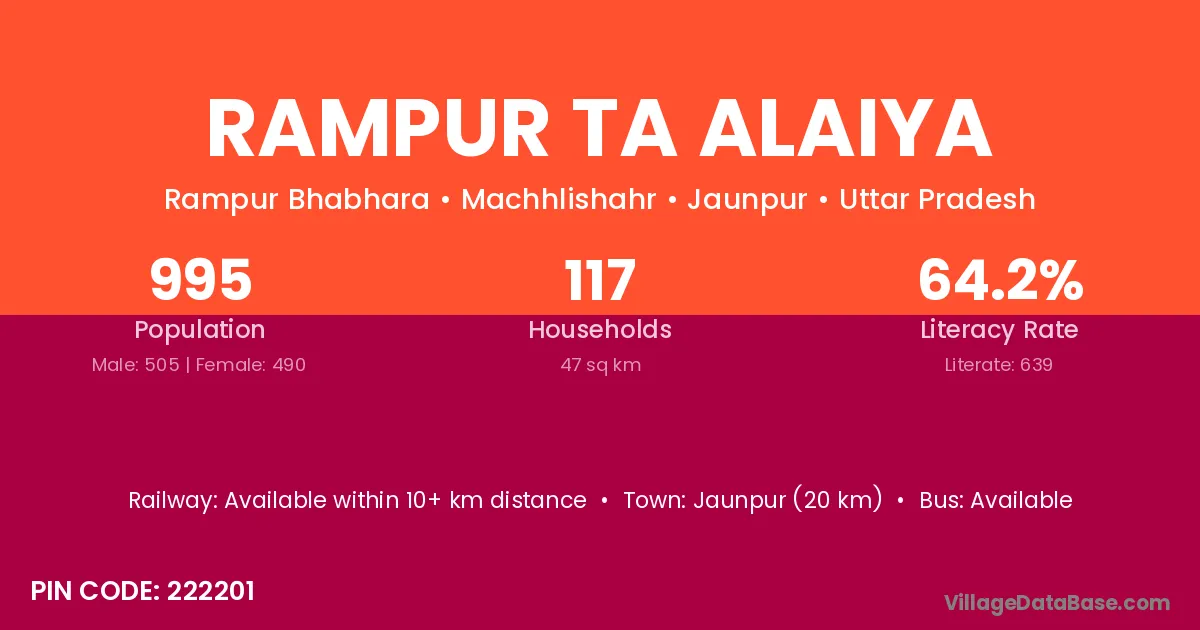 Jaunpur (20 km) is the nearest town to Rampur Ta Alaiya village for major economic activities and is located approximately 20 km away.