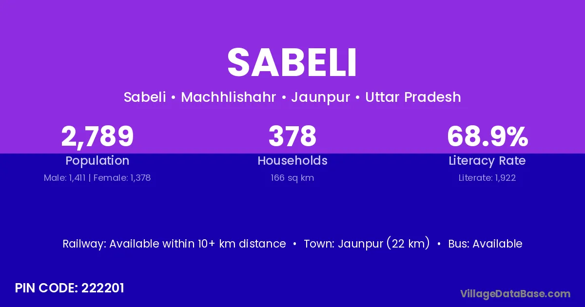 Jaunpur (22 km) is the nearest town to Sabeli village for major economic activities and is located approximately 22 km away.