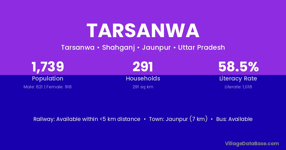 Machhlishahr (10 km) is the nearest town to Tarsanwa village for major economic activities and is located approximately 10 km away.