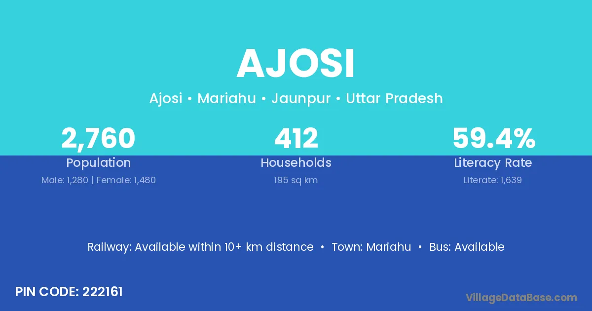 The literacy rate of Ajosi village is 59.38%. Male literacy stands at 73.59% and female literacy at 47.09%.