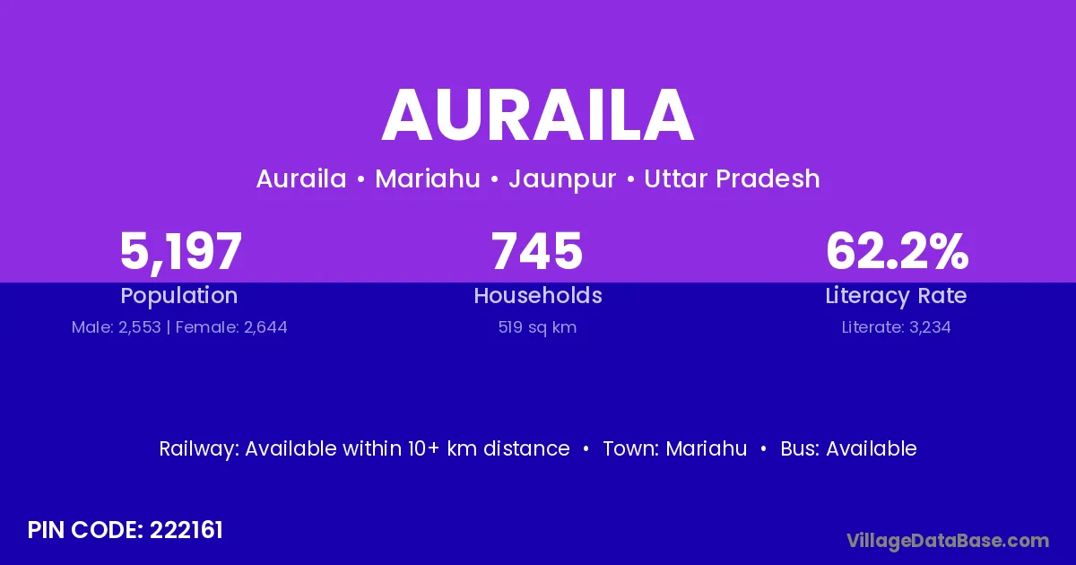 Auraila village has a total population of 5,197 people, of which 2,553 are males and 2,644 are females.