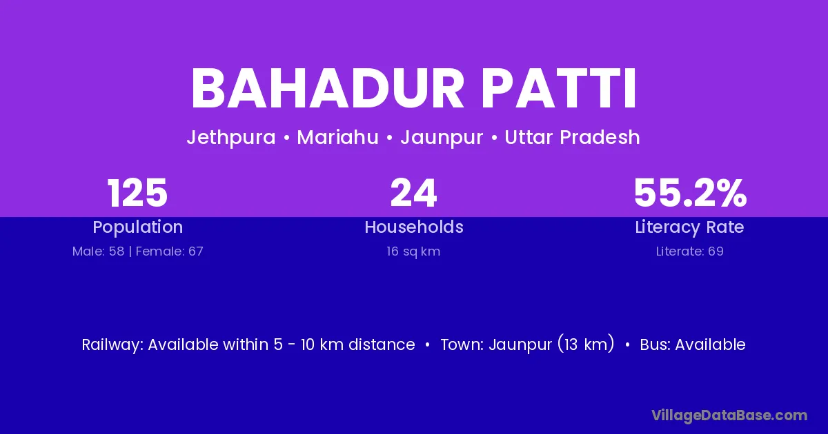 Jaunpur (13 km) is the nearest town to Bahadur Patti village for major economic activities and is located approximately 13 km away.