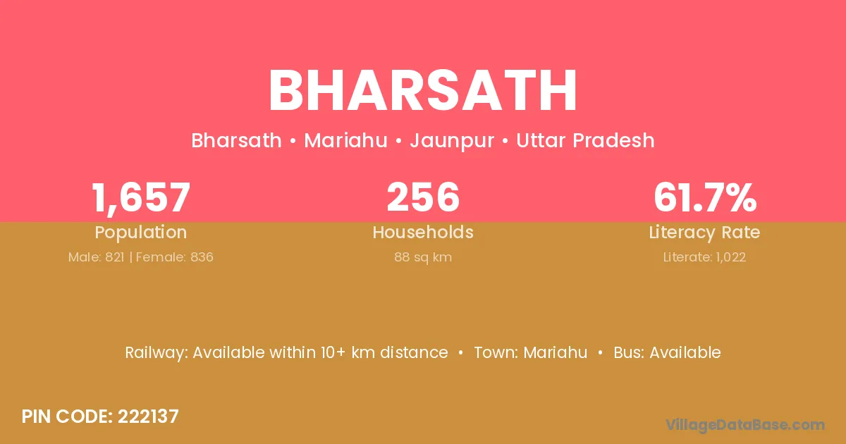 Bharsath village has a total population of 1,657 people, of which 821 are males and 836 are females.