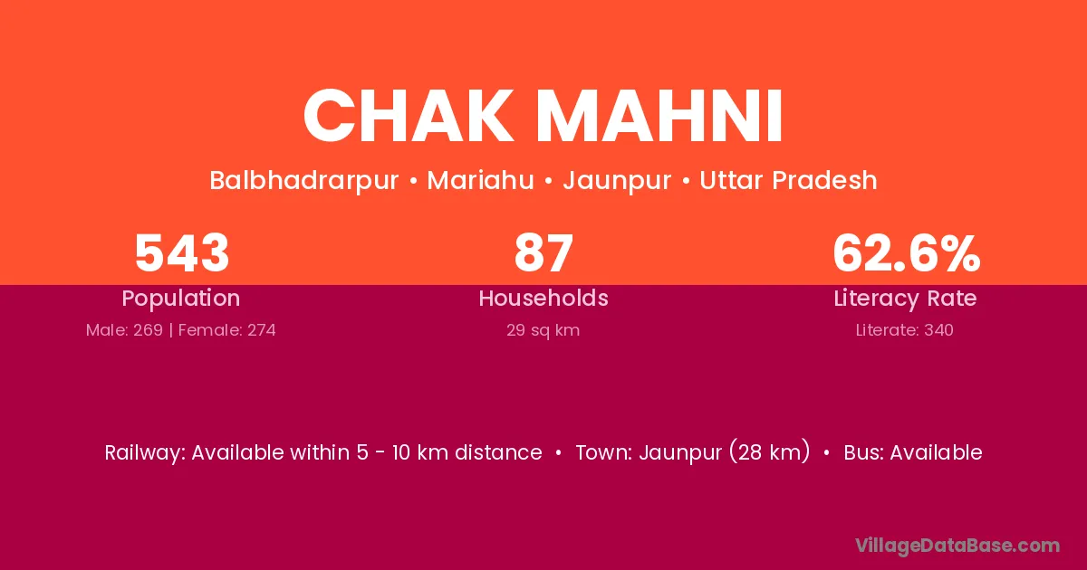 Jaunpur (28 km) is the nearest town to Chak Mahni village for major economic activities and is located approximately 28 km away.