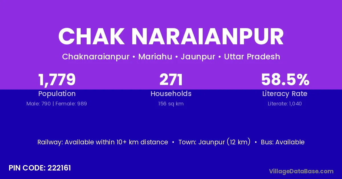Jaunpur (12 km) is the nearest town to Chak Naraianpur village for major economic activities and is located approximately 12 km away.