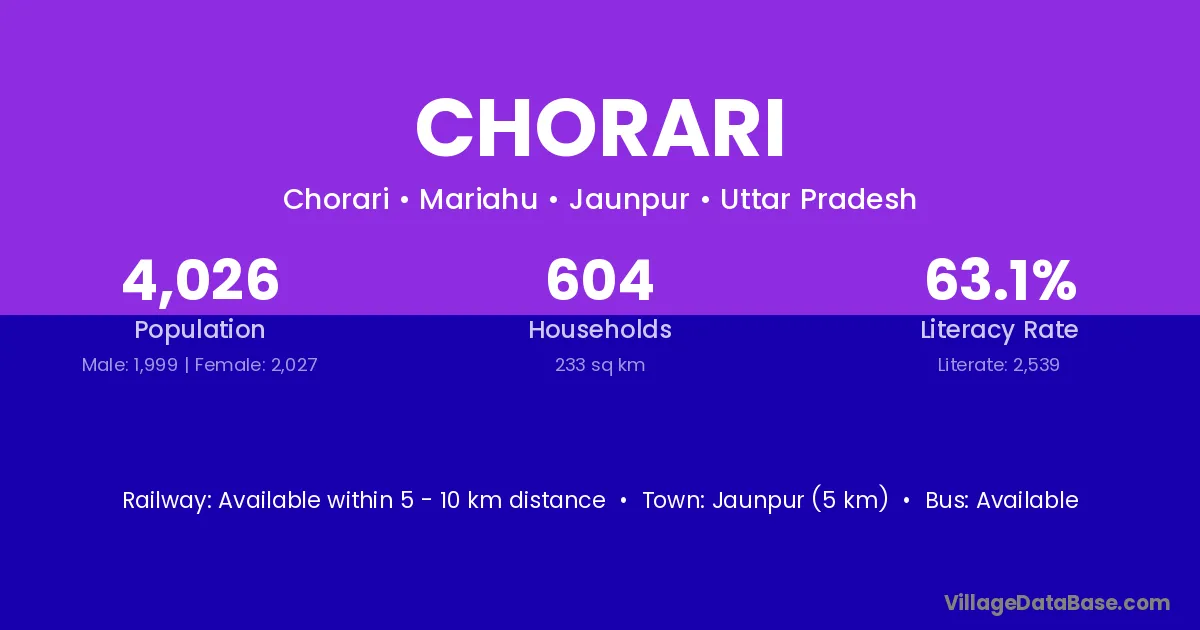 Jaunpur (5 km) is the nearest town to Chorari village for major economic activities and is located approximately 5 km away.