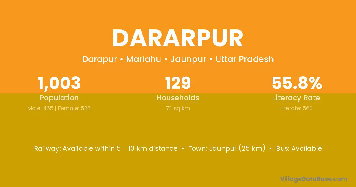 Jaunpur (25 km) is the nearest town to Dararpur village for major economic activities and is located approximately 25 km away.