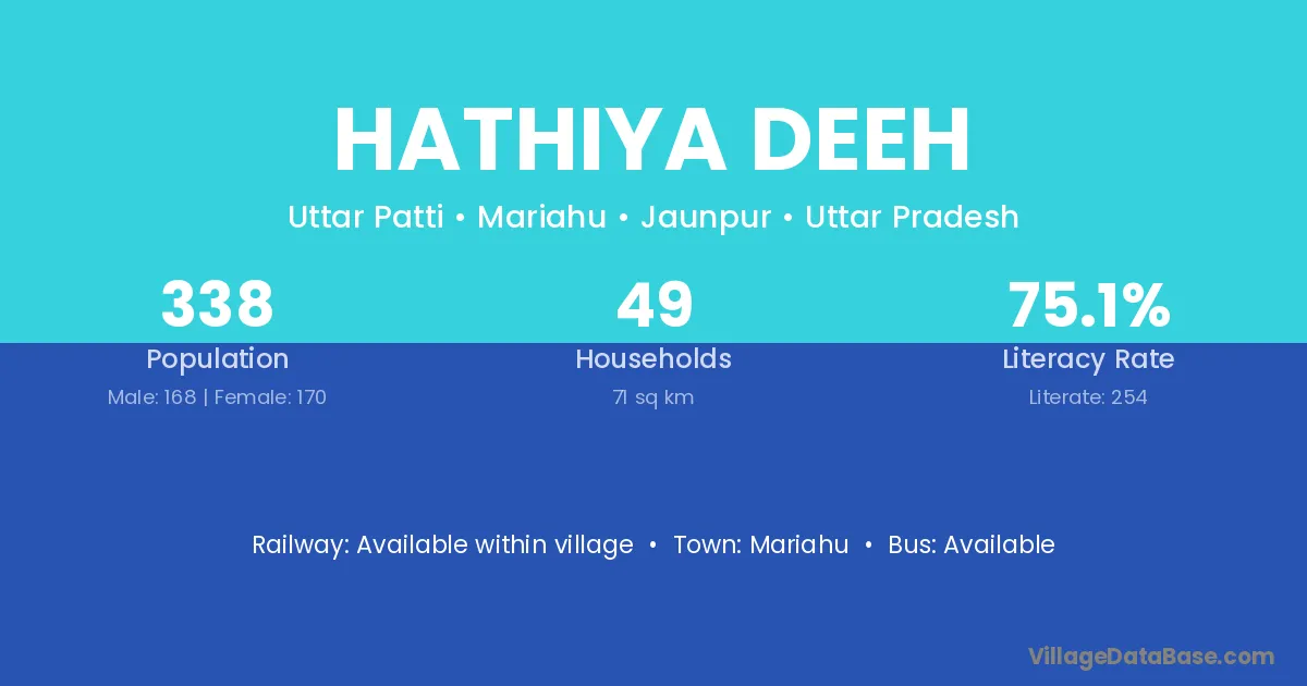 Hathiya Deeh village has a total population of 338 people, of which 168 are males and 170 are females.