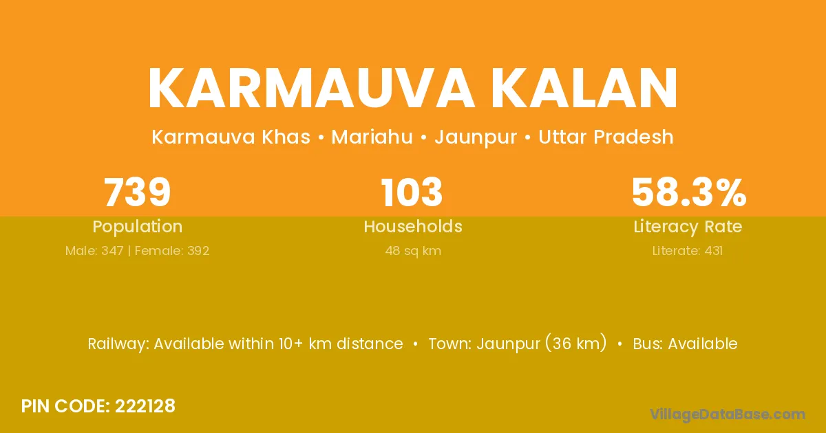 Jaunpur (36 km) is the nearest town to Karmauva Kalan village for major economic activities and is located approximately 36 km away.
